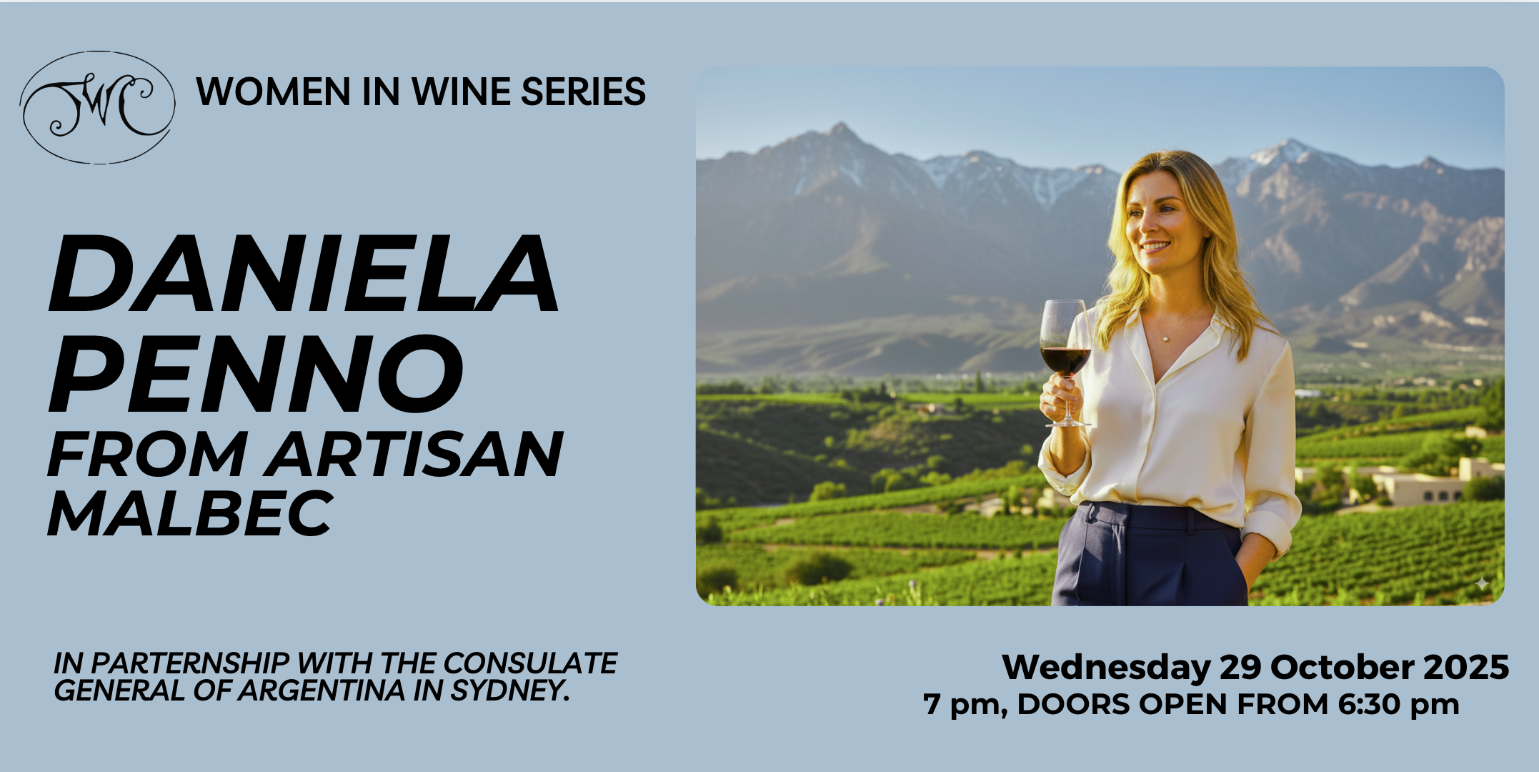 Join us this spring for a new Women in Wine event with Daniela Penno, from Artisan Malbec at The Women's Club presented in partnership with the Consulate General of Argentina in Sydney.